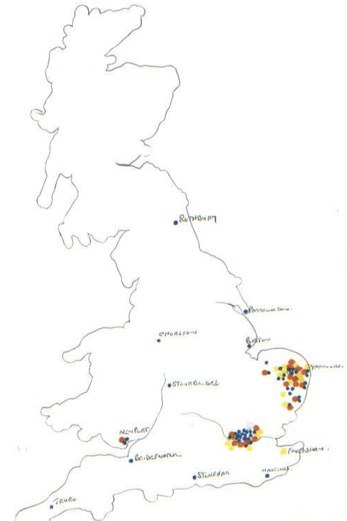 Most of the activity occurs in the area of Norfolk and Suffolk,any doubts about where the Watling's are coming from should be dispelled. The same pattern is continued up until 1870,Watling's outside this area can be counted on the fingers of one hand, after which they explode over the whole country and indeed the world. |
