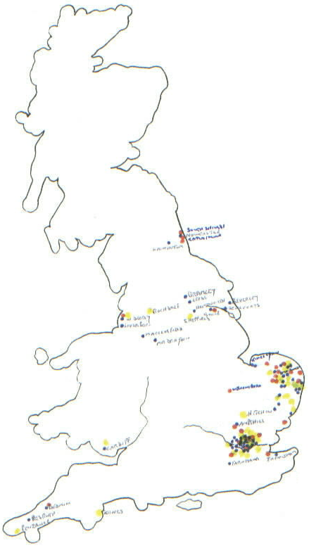 | South Shields, Newcastle, Gateshead, Lanchester, Bramley, Leeds, West Derby, Liverpool, Rochdale, Hemsworth, Beverley, Sheffield, Goole, Sculcoates, Macclesfield, Market Drayton, Kings Lynn, Norwich, Wellingborough, Cardiff, Hitchin, Ampthill, Penzance, Redruth, Bodmin, Totnes, Farnham, Faversham. | |