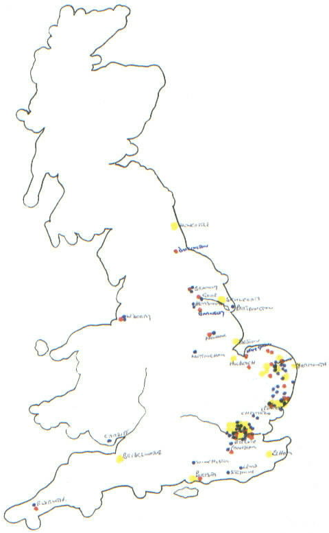 Darlington, West Derby, Bramley, Goole, Hemsworth, Barnsley, Sculcoates, Partrington, Newark, Boston, Nottingham, Holbeach, Kings Lynn, Norwich, Yarmouth, Cardiff, Chelmsford, Ipswich, Redruth, Bridgewater, Reigate, Farnham, Winchester, Portsea, Lewes, Steyning, Elham |