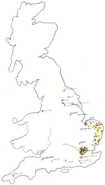 | Darlington, York, Leeds, Barnsley, Goole, Beverley, West Derby, Newark, Lincoln, Kings Lynn, Cambridge, Norwich, Cardiff, Bridgewater, Tisbury, Redruth, Winchester, Watford, Ipswich, Lexden, Farnham, East Grinstead, Lewes, Medway. | |