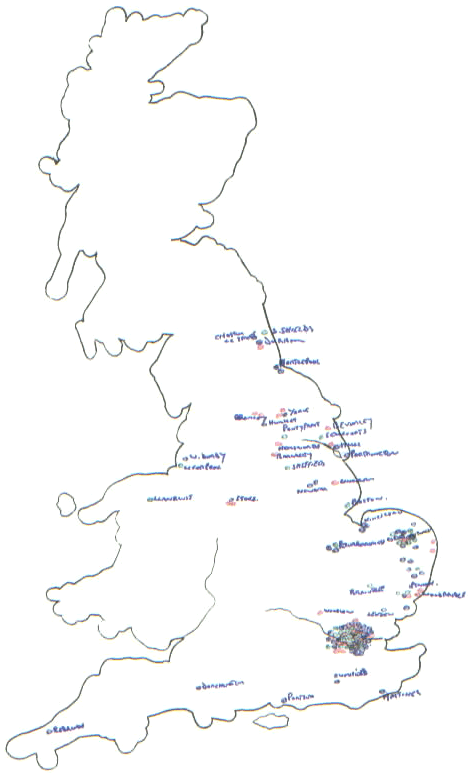 | Chester le Street, South Shields, Durham, Hartlepool, bramley, York, Hunslet, Pontyfract, Beverley, Sculcoats, West Derby, Liverpool, Hemsworth, Barnsley, Sheffield, Hull, Partrington, Llanwryst, Stoke, Newark, Lincoln, Boston, Kings Lynn, Peterborough, Norwich, Braintree, Ipswich, Woodbridge, Windsor, Lexden, Redruth, Dorchester, Portsea, Guildford, Hastings. | |