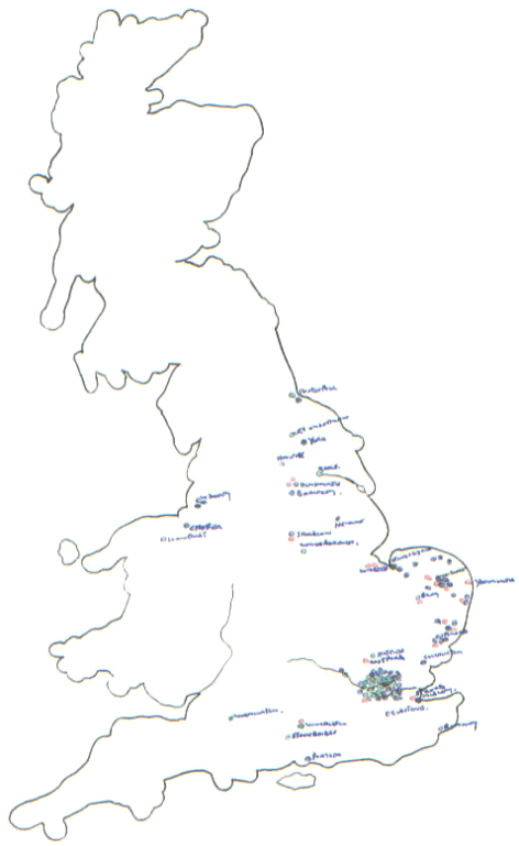 | Hartlepool, Gt.Ouseburn, York, Halifax, Goole, West Derby, Chester, Llanwryst, Hemsworth, Barnsley, Shardlow, Newark, Loughborough, Wisbech, Kings Lynn, Norwich,Gt.Yarmouth, Ely, Ipswich, Hatfield, Watford, Colchester, Warminster, Winchester, Stockbridge, Portsea, Godstone, Strood, Medway, Romney. | |
